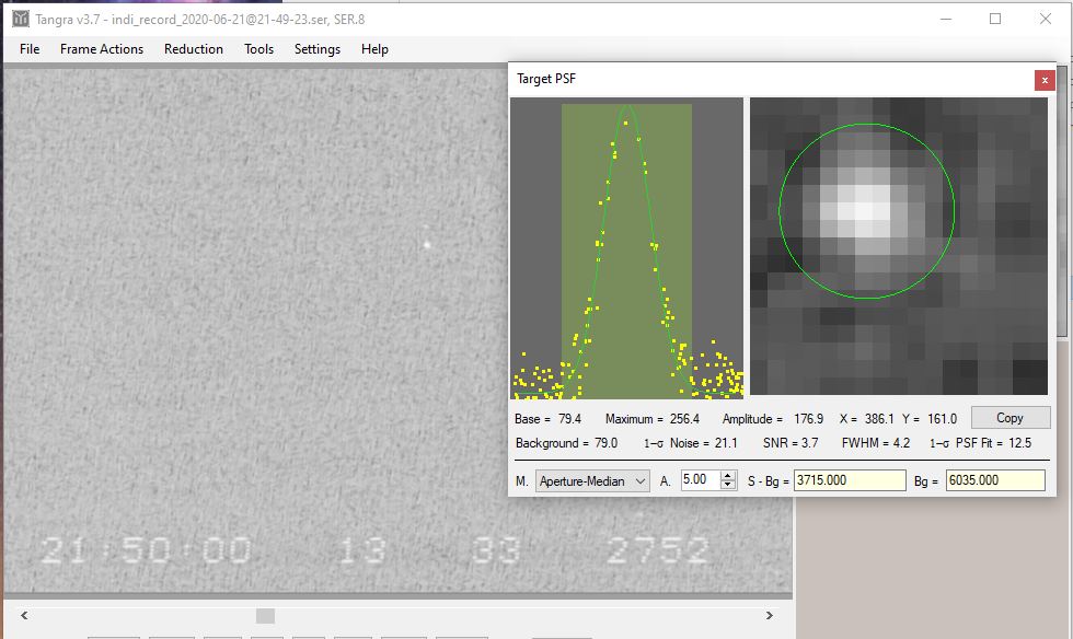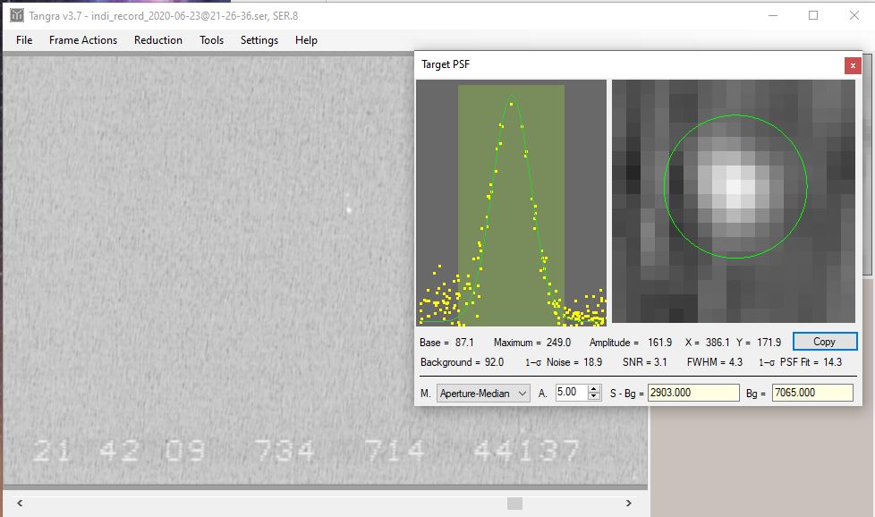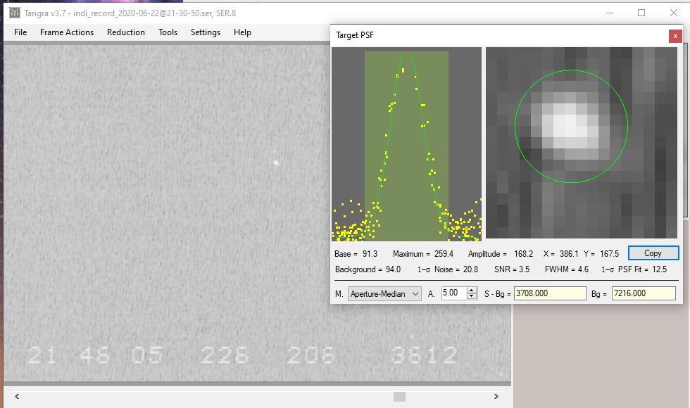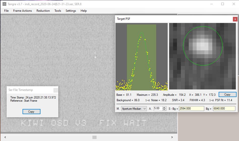 J’ai utilisé la caméra WATEC 910HX avec incrustation de temps GPS, afin de dater les images de façon précise. La caméra a été orientée de façon à ce que les étoiles défilent horizontalement sur l’image. Avec des photosites d’une largeur de 8.4 microns, et la focale de 1m du télescope, on a un échantillonnage d’environ 1.7 arcsec par pixel, ce qui implique que l’étoile se déplace sur l’image d’environ 8 pixels chaque seconde.